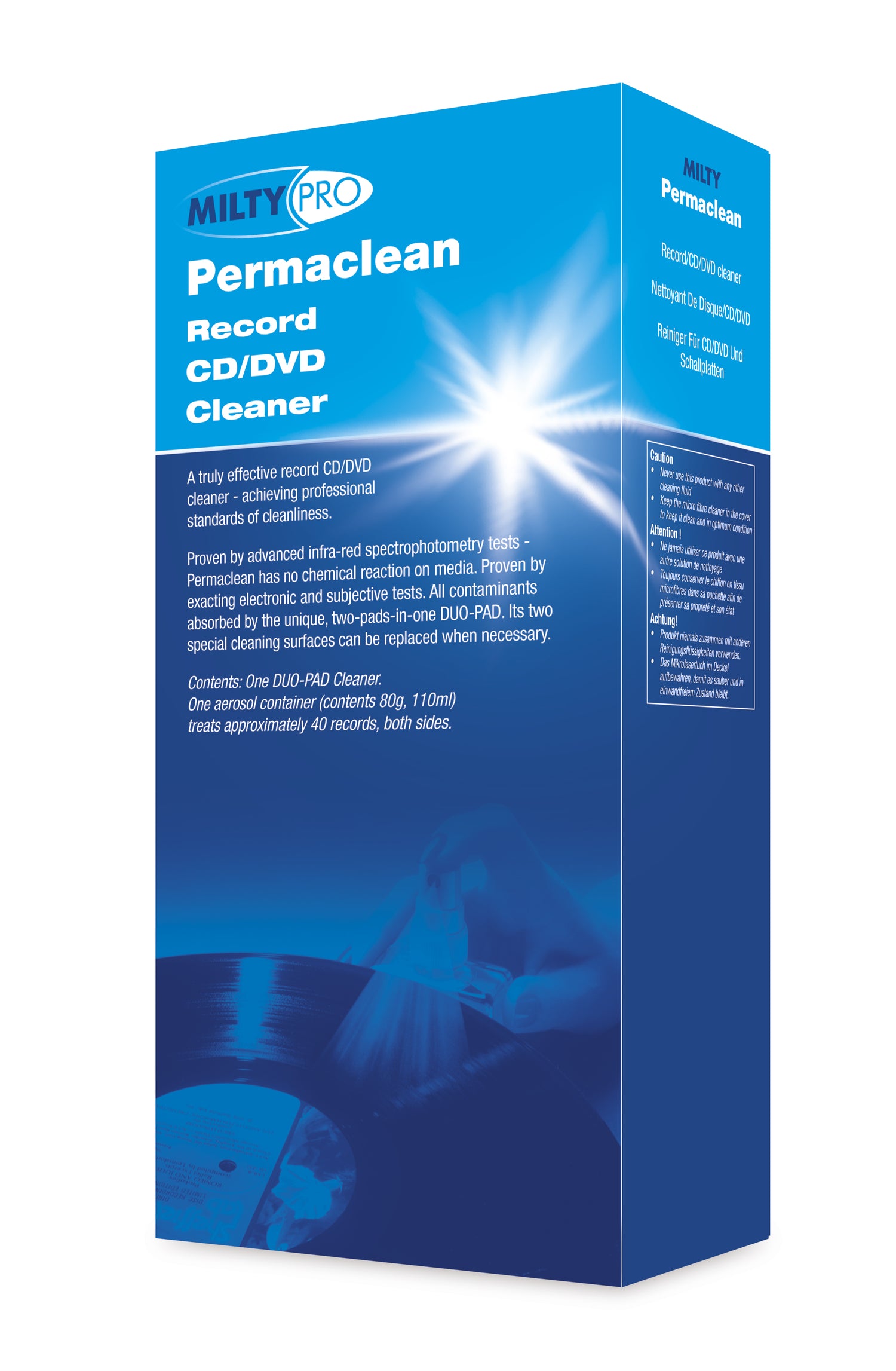 The Milty Permaclean kit consists of a special dust, grit and grease removing fluid and a customised "Duopad" surface cloth. Suitable for cleaning vinyl records, CDs and DVDs - keep your collection spick and span with Milty Permaclean.