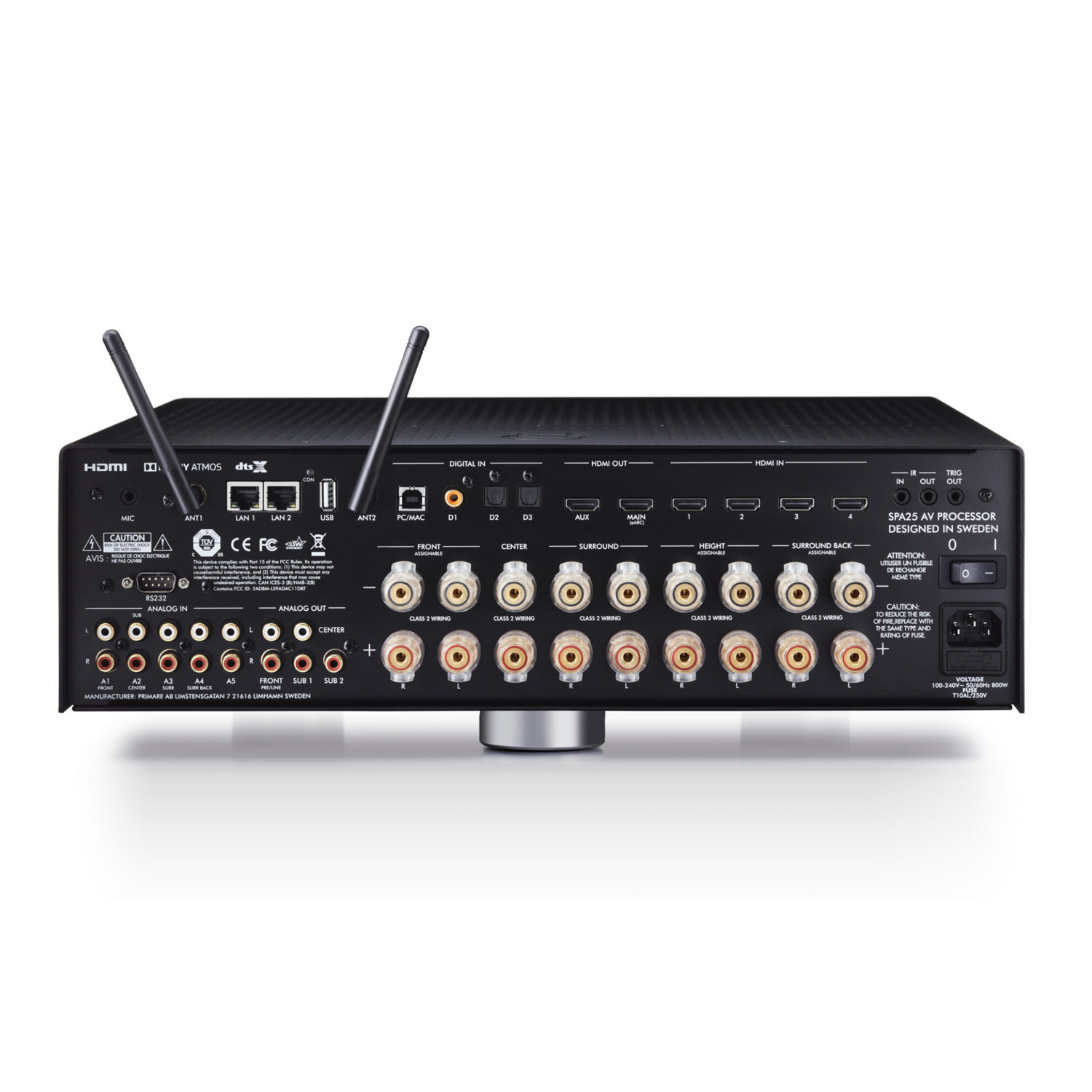 Dolby Atmos provides a multidimensional sound experience. Not only are there front and rear channels, but height channels. Objects, such as aircraft, can be positioned anywhere in the sound field, including above the listener. This is known as object-based sound and gives an all-encompassing and immersive experience. The SPA25 features right and left height channels. DTS X is another object-based sound processor that does not need high channels. It can also provide a more immersive experience.
